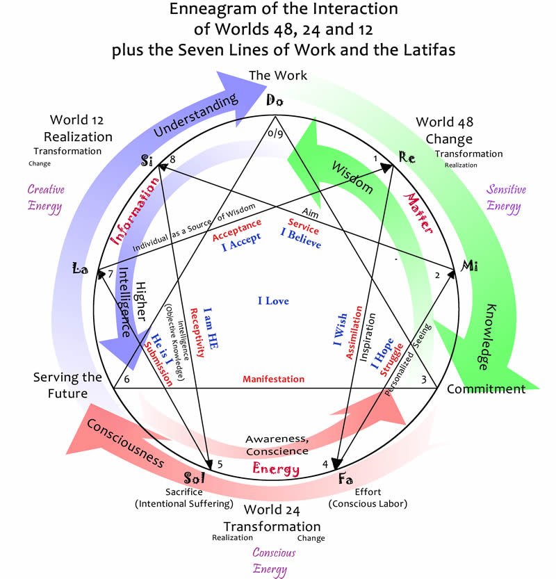 We will make extensive use of the enneagram, J.G Bennett’s schema for the different levels of selfhood, exercises to gain direct experience with the Physical, Astral and Causal worlds, understanding latifas and much more.The enneagram shown below will provide a starting point for our enquiry.